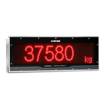 Alphanumeric graphic repeater with RGB HIGH LUMINOSITY LED matrix, ideal for displaying weight and operational messages. Depending on the connected indicator, it is possible to display weight with large digits or customisable operational messages. RGB technology allows you to change the colour displayed, with a traffic light function (red, yellow, green). Stainless steel enclosure and IP68 protection rating.