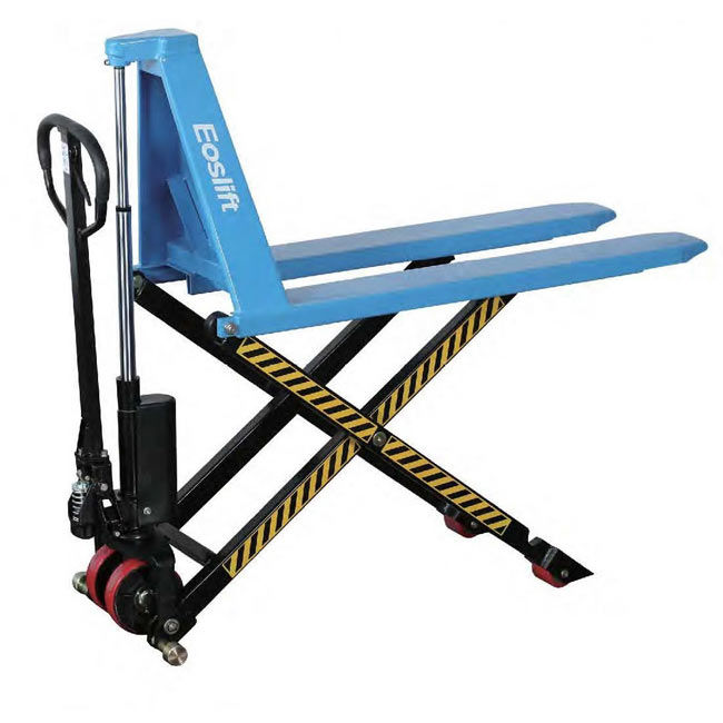 Eoslift USA Superior Scissor Lift Pallet Truck is constructed with only high quality materials and craftsman-ship. New German Seals System, 2200 lbs. weight Cap., Fork-27 in. x 45 in., Polyurethane Wheels, Steel Hubs, Padded Handles, Raise Height 31.5 in.