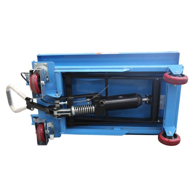 The poly steel wheels are designed to provide exceptional maneuverability in tight areas.  This lift table uses a standard handle with a lift release lever and the foot pedal powers the hydraulic lift.