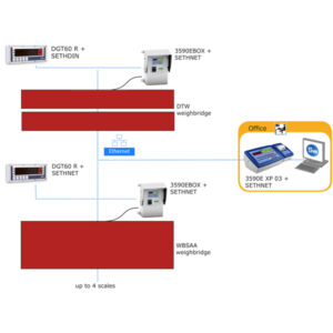Scale Network is a network of 3590E AF03 indicators for weighbridges, connected to each other through the special SETHNET ethernet interface. Thanks to the SCALE NETWORK system, on any of the connected indicators it is possible to execute a weighing operation or a modification of the database, with a real-time updating of all the connected indicators.