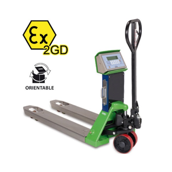 Pallet truck scales, with built-in electronic weighing, for dangerous areas classified as hazardous (ZONES 1 and 21 & 2 and 22) in accordance with Ex II 2G IIB T4 Gb X and Ex II 2D IIIC T197°C Db X.