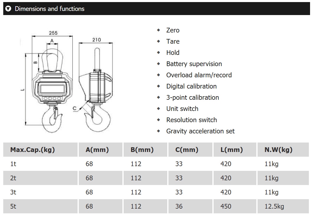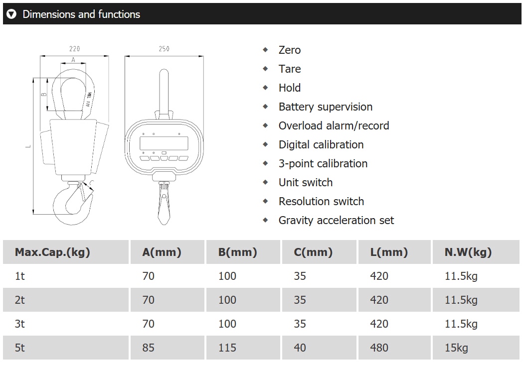 • Function: Zero, Tare, Hold, Auto power-off, Battery status, Overload alarm, Unit switch kg/ Lb., digital calibration, 3-point calibration, Resolution switch