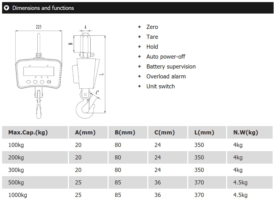 • Product weight: models with capacity of 100-300kg = 4 kg | 500-1000kg = 4.5 kg